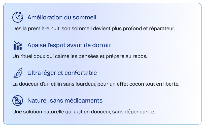 👉 Résultat : l’esprit se calme, le corps se relâche, et l’endormissement devient naturel et beaucoup plus profond.